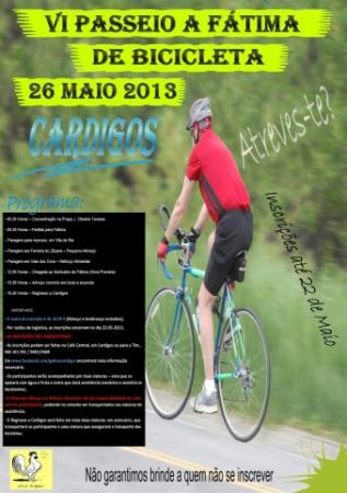 A Associação “Os Galitos” de Cardigos vão realizar mais um passeio de bicicleta a Fátima. Será no próximo dia 26 de maio e a concentração está marcada para as 5h30 na Praça J. Oliveira Tavares, sendo que a partida dar-se-á 15 minutos depois.