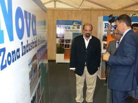 Passagem da comitiva inaugural pelo painel da nova Zona Industrial de Cardigos com o vereador natural da freguesia de Cardigos, António José Louro, a explicar os pormenores da obra ao secretário de Estado da Administração Local e Reforma Administrativa, Paulo Simões